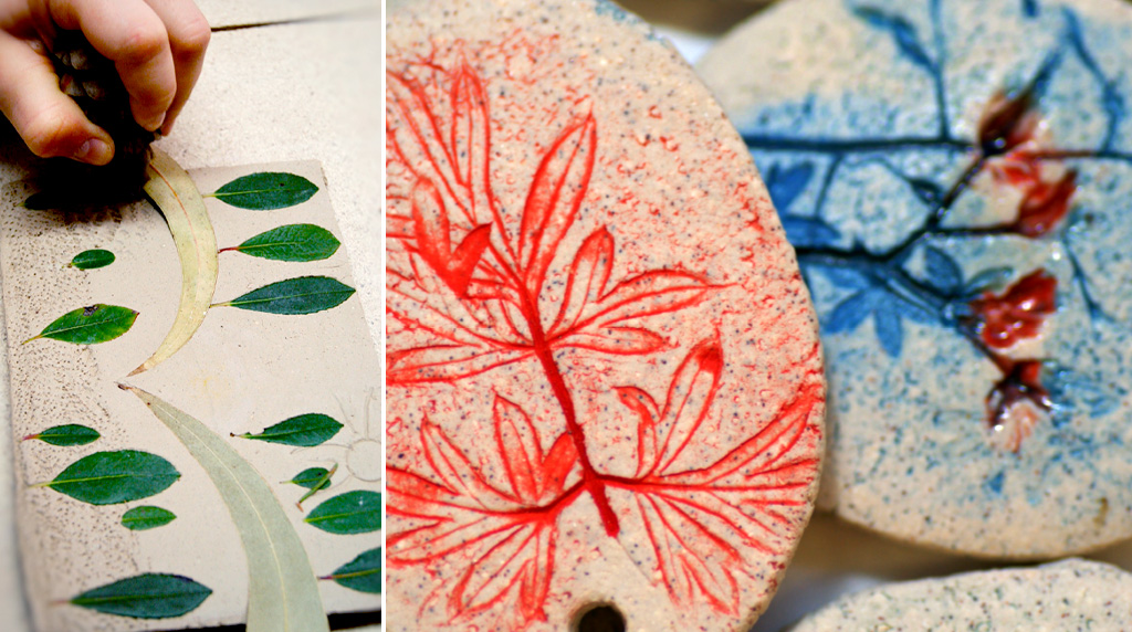 Manufatti in argilla (lastre, cornici, piccole ciotole) con impronte naturali, reinterpretazioni personali della bellezza di foglie e sassi.